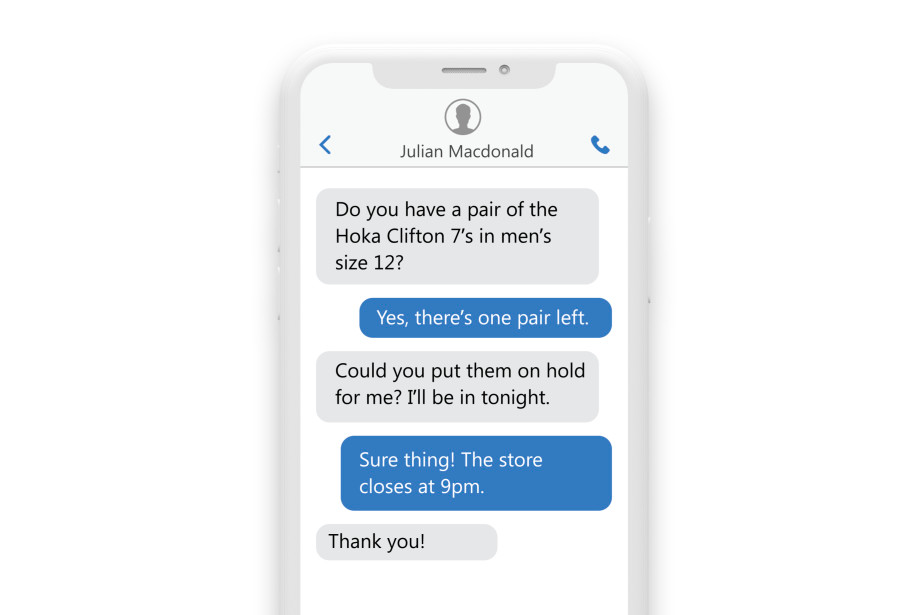 4. “Customer: Do you have a pair of the Hoka Clifton 7’s in men’s size 12?; Running World: Yes, there’s one left. ; Customer: Could you put them on hold for me, I’ll be in tonight? Running world: Sure thing, store closes at 9pm. Customer: Thanks!”